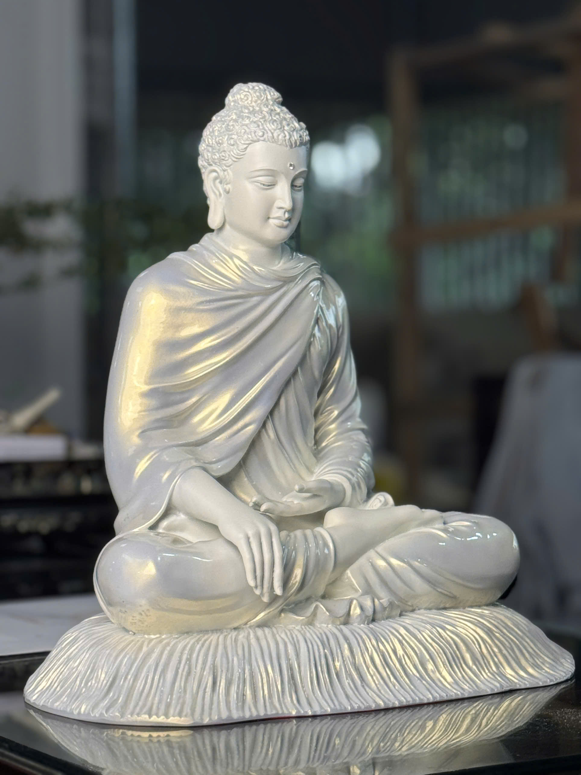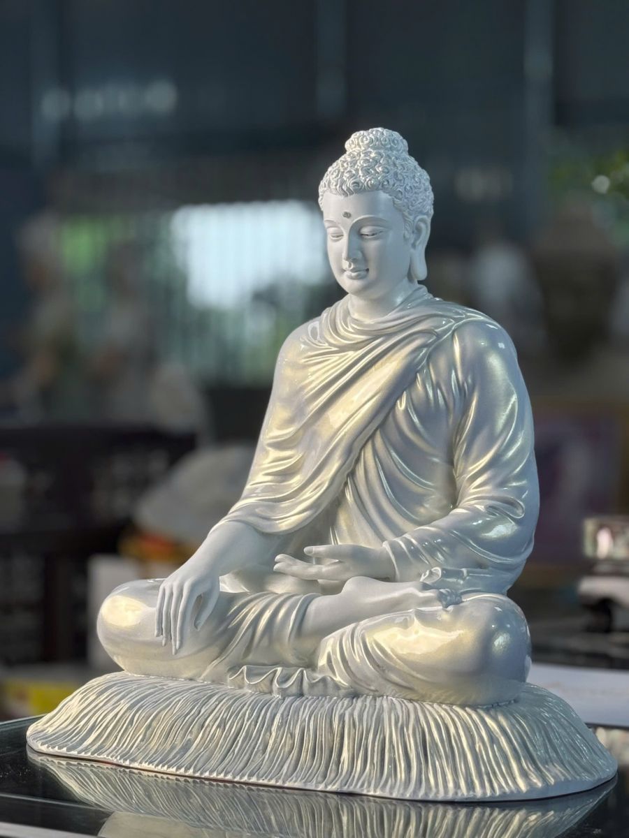 Hình dáng: Thường ngồi trên đài sen, mắt nhìn xuống, thể hiện sự quan sát nội tâm và sự thanh tịnh.