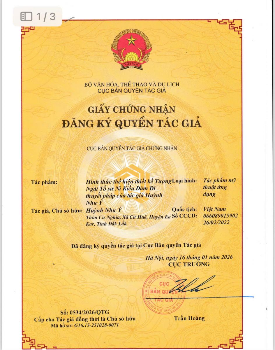Bản quyền bảo vệ tác phẩm nghệ thuật : HUỲNH NHƯ Ý ( TÁC PHẨM : NGÀI TỔ SƯ NI KIỀU ĐÀM DI )